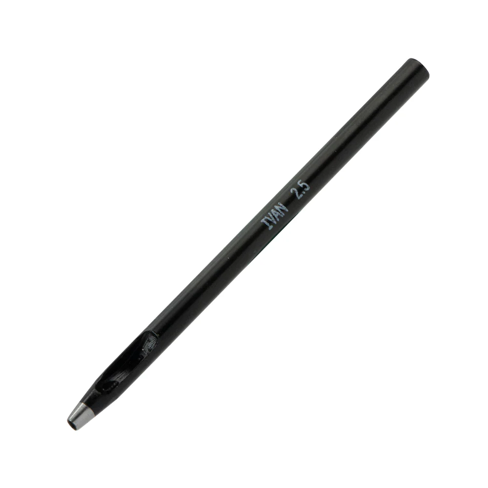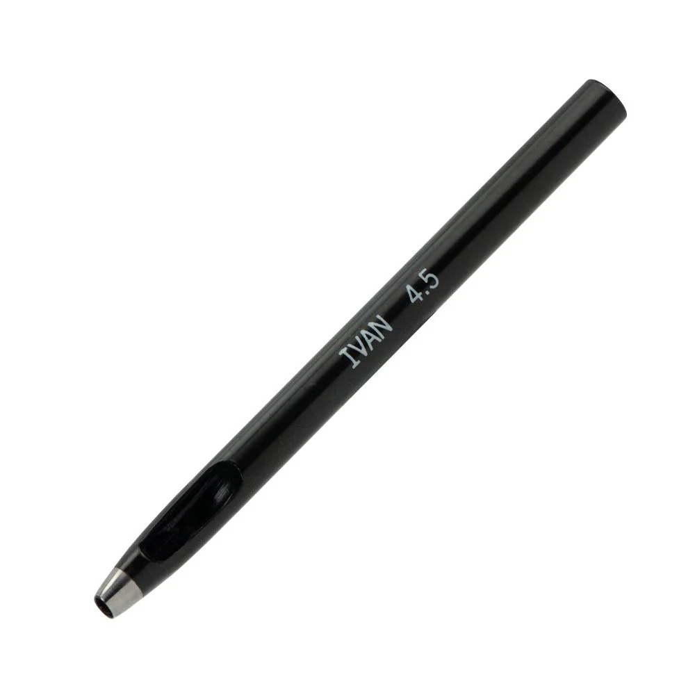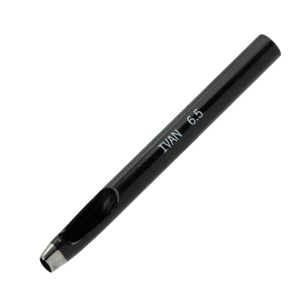 This oval punch is used for driving holes in leather for e.g., belt notches, etc. To drive the punch through the leather, use a rawhide maul as it strikes with great force while also protecting the metal.