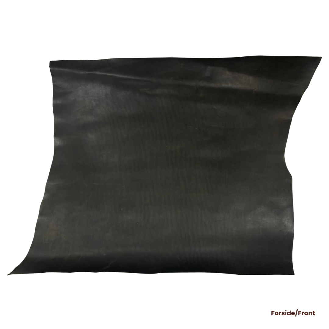The hides are aniline-dyed and have a smooth, even surface. They are finished with a light coating that gives them a subtle sheen.